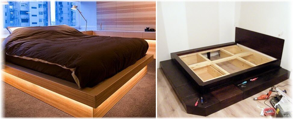 Подиум хорош тем, что его можно построить самостоятельно. Сначала намечается место будущего подиума, затем с помощью деревянных брусьев создается каркас. Каркас можно также выполнить из металла, а поверхность покрыть деревом или ламинатом. Можно создать мягкий подиум, обтянув его тканью для обивки мебели.   Чаще всего подиум можно располагают возле окна или по центру комнаты. Если подиум расположен возле стены, из такого же материала можно самостоятельно изготовить изголовье. Получится прекрасная альтернатива двуспальной кровати.