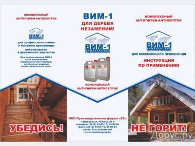 Производственная фирма "ЕС" предлагает Вашему вниманию комплексный антипирен-антисептик ВИМ-1. Данные составы прекрасно подходят как для профессионального, так и бытового использования.