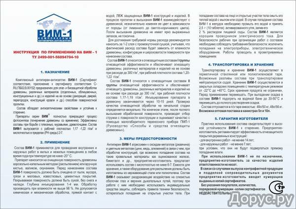 ВИМ-1 предназначен для огне-биозащитной обработки древесины, различных материалов и изделий на ее основе (декораций, дверей, перегородок, конструкций кровли) способом поверхностной пропитки.
