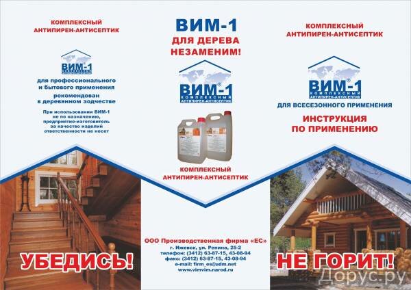 ВИМ-1 предназначен для огне-биозащитной обработки древесины, различных материалов и изделий на ее основе способом поверхностной пропитки.