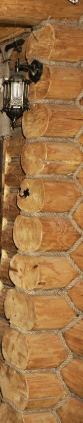 | Увидела вот такое дизайнерское решение. Деревянный дом, а между каждым брусом сделаны обтяжки из толстой льняной веревки. Я вначале решила, что это декор. Но таким образом сделаны все стены и внутри и снаружи и в помещениях, которые в принципе, декорировать не обязательно. Возможно, это не только декор? Может это еще и какой-то способ утепления? И как так смогли обтянуть каждое бревнышко?