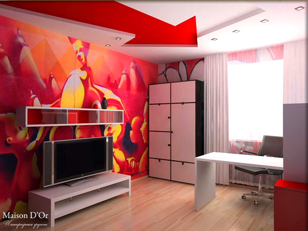 | Для кого вы хотите разрисовать комнату граффити? Если для себя, то творите и получайте удовлетворение от творчества. Если для гостей, то всем не угодишь, вкусы у всех разные. Хотя и граффити бывают разными. Есть отталкивающие и агрессивные, со множеством непонятных никому символов и фигур. А есть вполне жизнеутверждающие и приемлемые для жилья, как вам привели пример выше.