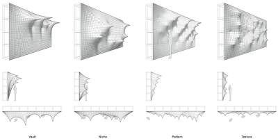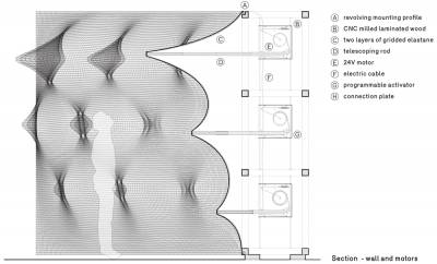 Поверхность активируется сеткой моторизованных узлов, замаскированных за полупрозрачными слоями синтетической ткани. Они запрограммированы для перемещения и периодически производить то, что архитекторы называют "пики и провалы". Наслоение на эластичной ткани также создает муаровый эффект по всей поверхности стены.