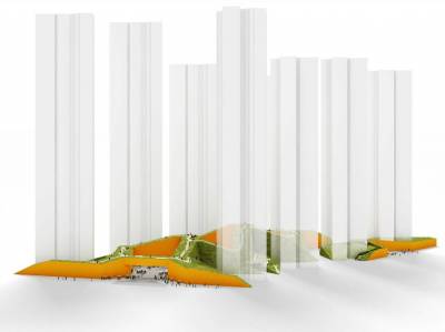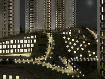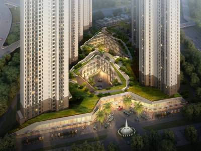 Прокатки зеленой крыша также служит парком пространство вклинивающий между высокими жилыми башнями. Извилистые пути пешеходов ведут к высоким точкам каждого ландшафтного холма и горят рядами огней ночью. Смешанное использования центра планируется завершить в 2015 году и будет открыта для публики в 2016 году.