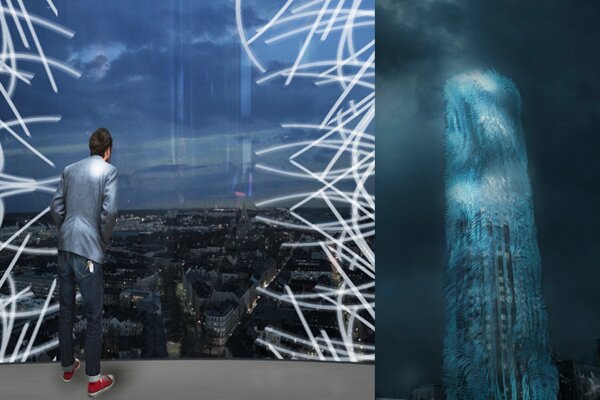 Небоскреб Strawscraper покрыто волосами, которые могут использовать энергию ветра. Здание выглядит, как будто лежит на дне моря, с его длинной ветреницей, как волосы, но его технология прочно посажены на твердую землю в будущем.