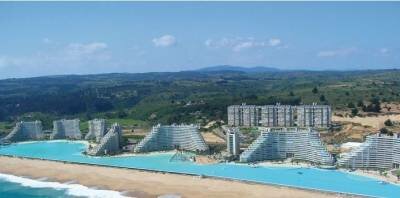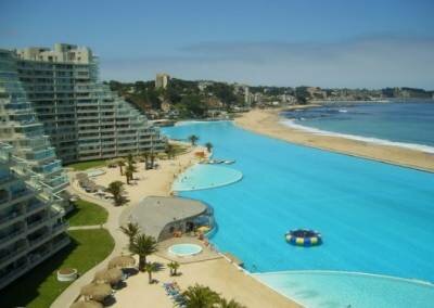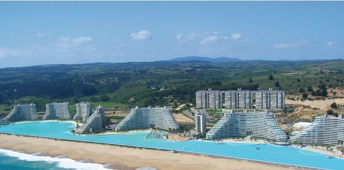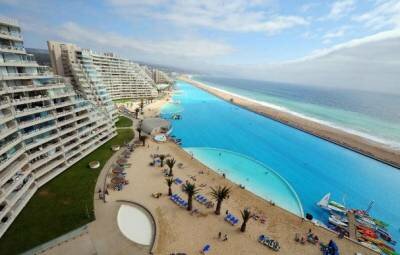 |  1013 метров в длину, площадью в 8 га бассейн Сан-Альфонсо-дель-Мар на курорте Альгарробо в Чили по праву может считаться самым большим в мире. Официально подтвердила и Книга Рекордов Гиннеса в декабре 2006 года.