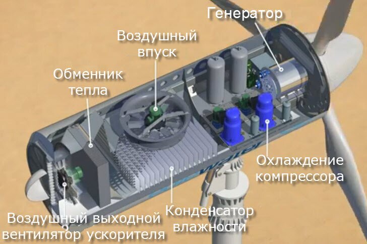 Фантастически простой дизайн имеет дополнения, которые облегчают для запуска и поддержания в отдаленных районах . Турбина имеет большой фильтр на, чтобы уменьшить количество пыли втягиваемая в системе когда засасывает воздух для получения конденсата. Для облегчения ремонта 24-метровую турбину также можно поднимать и опускать.