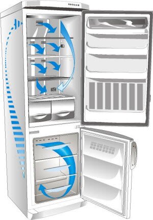 Система No Frost основана на принципе циркуляции воздуха внутри камеры. Везде поддерживается равномерная температура. В современных холодильниках вентилятор расположен на задней стенке, иногда между камерами или встроен в дверцу (LG).