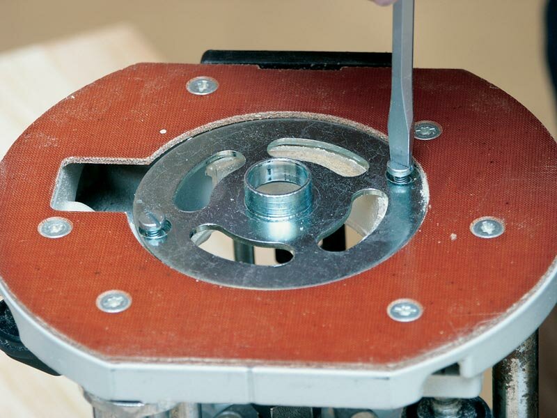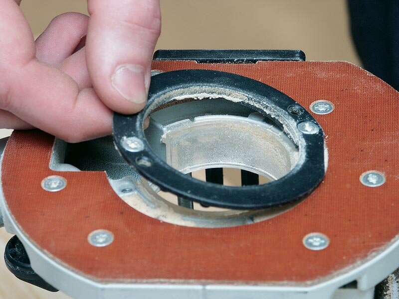 Копировальное кольцо. Для точной и удобной работы фрезер должен иметь гладкую подошву. Когда копировальная втулка не используется, паз, предназначенный для нее, закрывают кольцом