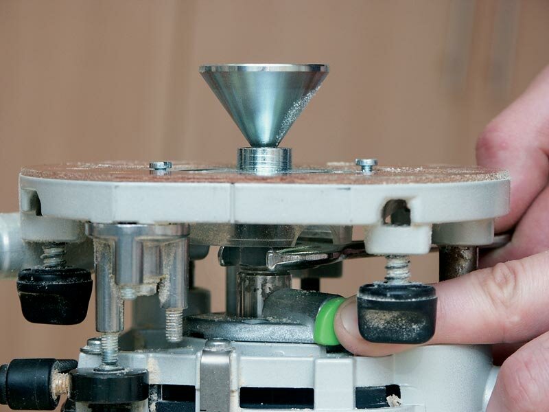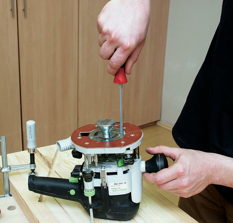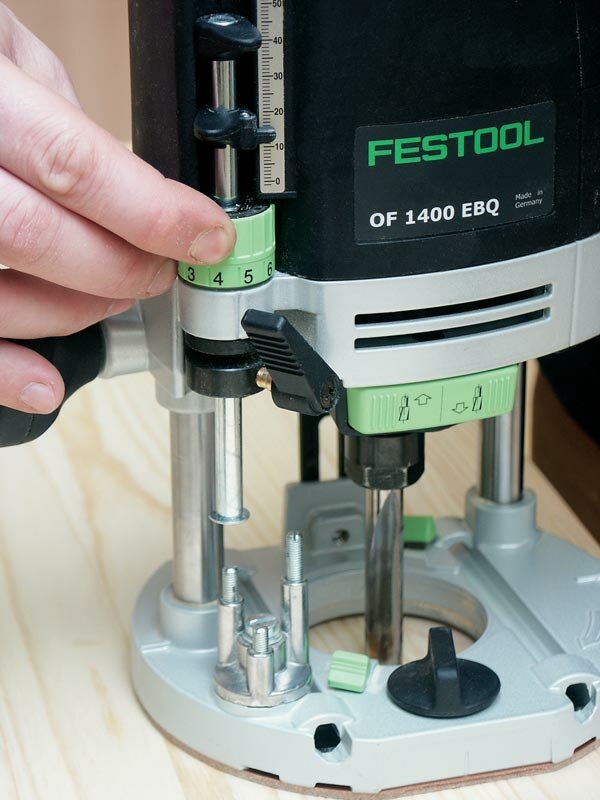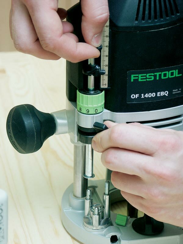4. Если операция требует точности, хороший фрезер позволяет скорректировать установленное значение глубины. Его изменяют, не ослабляя (чтобы не сбить) фиксации опорной штанги, а вращая регулировочное колесико. Это можно сделать заранее, добившись точного совпадения рисок указателя и шкалы, или после пробного прохода.