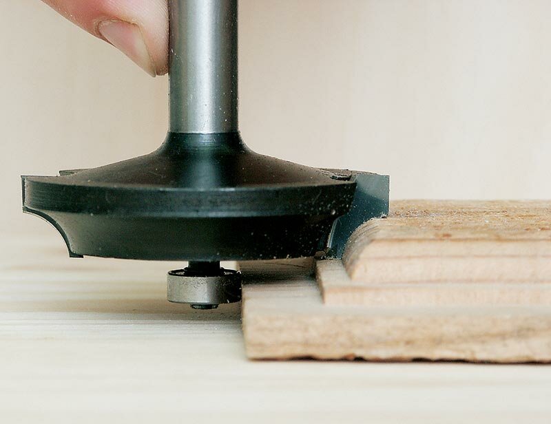 Самым элементарным и компактным устройством, задающим положение машины, становится сама фреза, если она дополнена миниатюрным шариковым подшипником. Он располагается под или над режущими ножами и соответственно опирается на верхний или на нижний край кромки. С помощью такой оснастки получают фасонные кромки или нарезают пазы под соединение, окантовку, уплотнитель и т.д.К достоинствам метода отнесем необременительность подготовительных операций (нужно настроить только вертикальное положение) и возможность точной обработки скругленных и криволинейных кромок (типичный пример - столешница). Недостатки вытекают из достоинств — сделать кривое ровным не удастся.