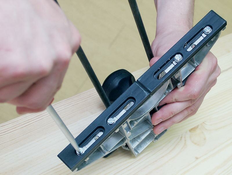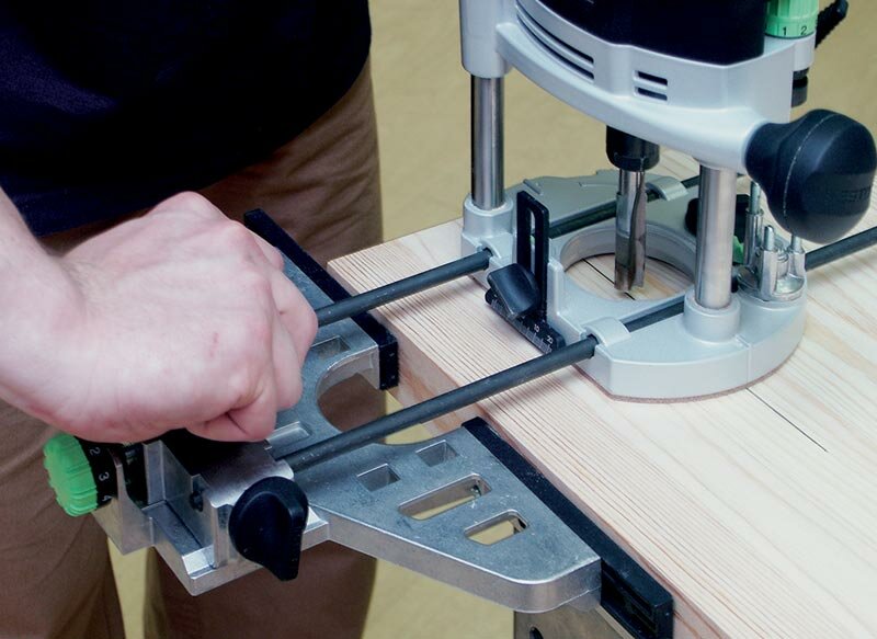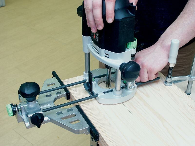 2. Фрезер устанавливают на линию разметки, упор подводят к кромке и фиксируют. В данном случае обе штанги зажимают вращением одной рукоятки, обычно — несколькими «персональными» винтами.
