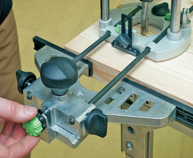 В особой комплектации подобные направляющие служат еще и для точного фрезерования отверстий, что особенно актуально при изготовлении мебели (на линейке есть отверстия со стандартным шагом, на машине - стопор; остается только выбирать нужные позиции и засверливаться).Важное замечание: набор деталей для работы по направляющей докупают не во всех случаях; он должен присутствовать в списке аксессуаров производителя и подходить к конкретному фрезеру.