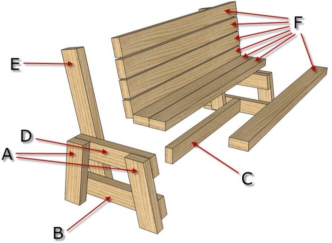 Закрепите гвоздями или саморезами планками (F) в рамках сидений, начиная с первого ламелей заподлицо с передним кромкам ног и нависающие часть сбоку должна быть 150 мм., зазор между планками примерно 10 мм. Собранную скамейку надо покрасить лаком 2-3 раза, между этапами лакировки стоит шлифовать.