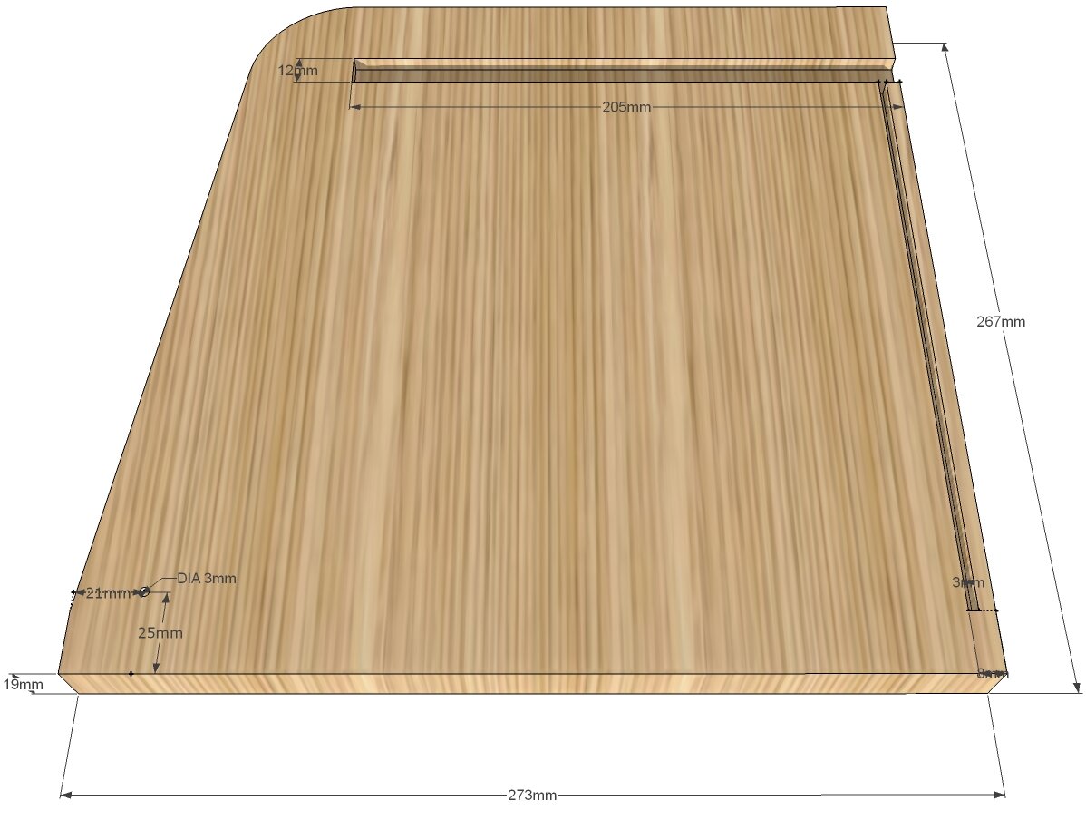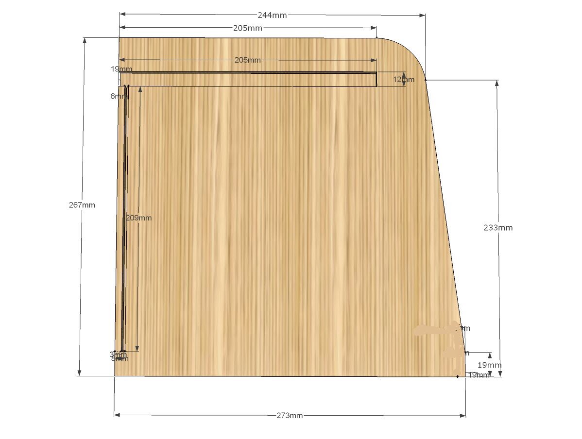 Отрежьте две боковые части одинаковой формы, округление сверху делайте гладкой кривой. Затем вырежьте пазы в каждой из этих лиц внутри. Канавки должна шириною 12мм, глубиною 6мм и длинною 205мм, 2-й паз ширина 3мм, глубина 6 мм и длина 209мм. Наконец, просверлить отверстие 3мм в любую сторону боковины, как показано на рисунке 25мм снизу и 21 мм с фронта. Цель этого в том, что петля штифт будет проходить через это отверстие, в каждую сторону от двери.