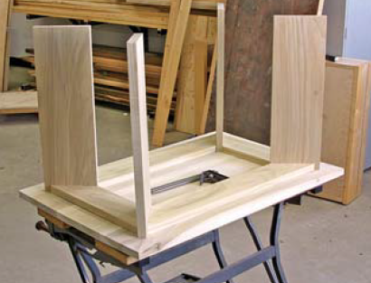Поместите рельсы и ножки в положении на столе. Рельсы и ножки присоединиться с двумя типами резьбовых соединений: винты с потайной головкой через ножки в длинные рельсы, и карманные винты через короткие рельсы на ножки. Также стоит нанести еще и клей.