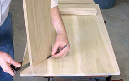 Вырежьте рельсы на несколько сантиметров длиннее с углом 45˚. Вырежьте фартуки размера с углом 45˚ с каждой стороны, затем отметьте и отрежьте на искоса угол в нижней части каждой ножки.