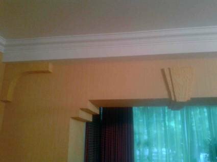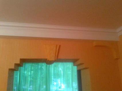 Вот как я поступил. Для начала, чтобы визуально выровнять высоту «парапета» я купил широкий «багет». Заставил строителей отмерить одинаковую высоту от начала «парапета» по всей окружности комнаты. Затем подрезая и выгибая нижнюю часть «багета», которая клеилась к «парапету» выставить его по линии. В итоге получилось, что ровная часть «парапета» имела одинаковую высоту до начала «багета», а сам «багет» ровной линией пристыковывался к потолку. Часть проблемы решить удалось.
