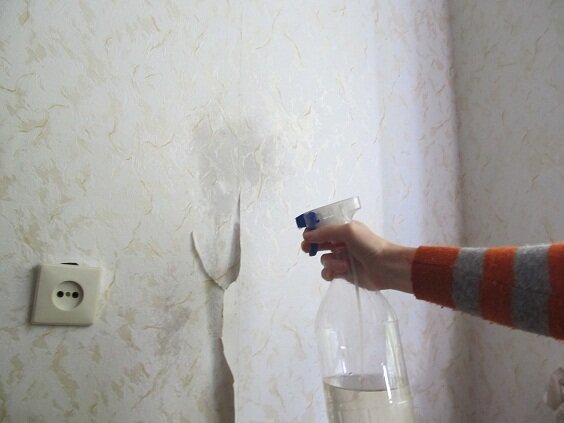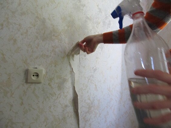 Следующим этапом будет зачистка стен. Старые обои взбрызгиваем водой с помощью распылителя. Аккуратно снимаем их, не повреждая стену, если это возможно. В этом процессе мне с удовольствием помогали дети, а также кошка (у нее получалось плохо).