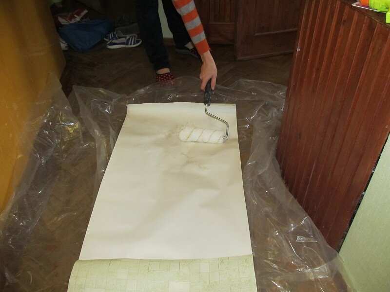 Итак, этап смазывания клеем. Наконец отмеряем с избытком (не всегда высота правой и левой стены комнаты одинакова) нужную длину обоев, отрезаем от рулона для начала одну полоску.
