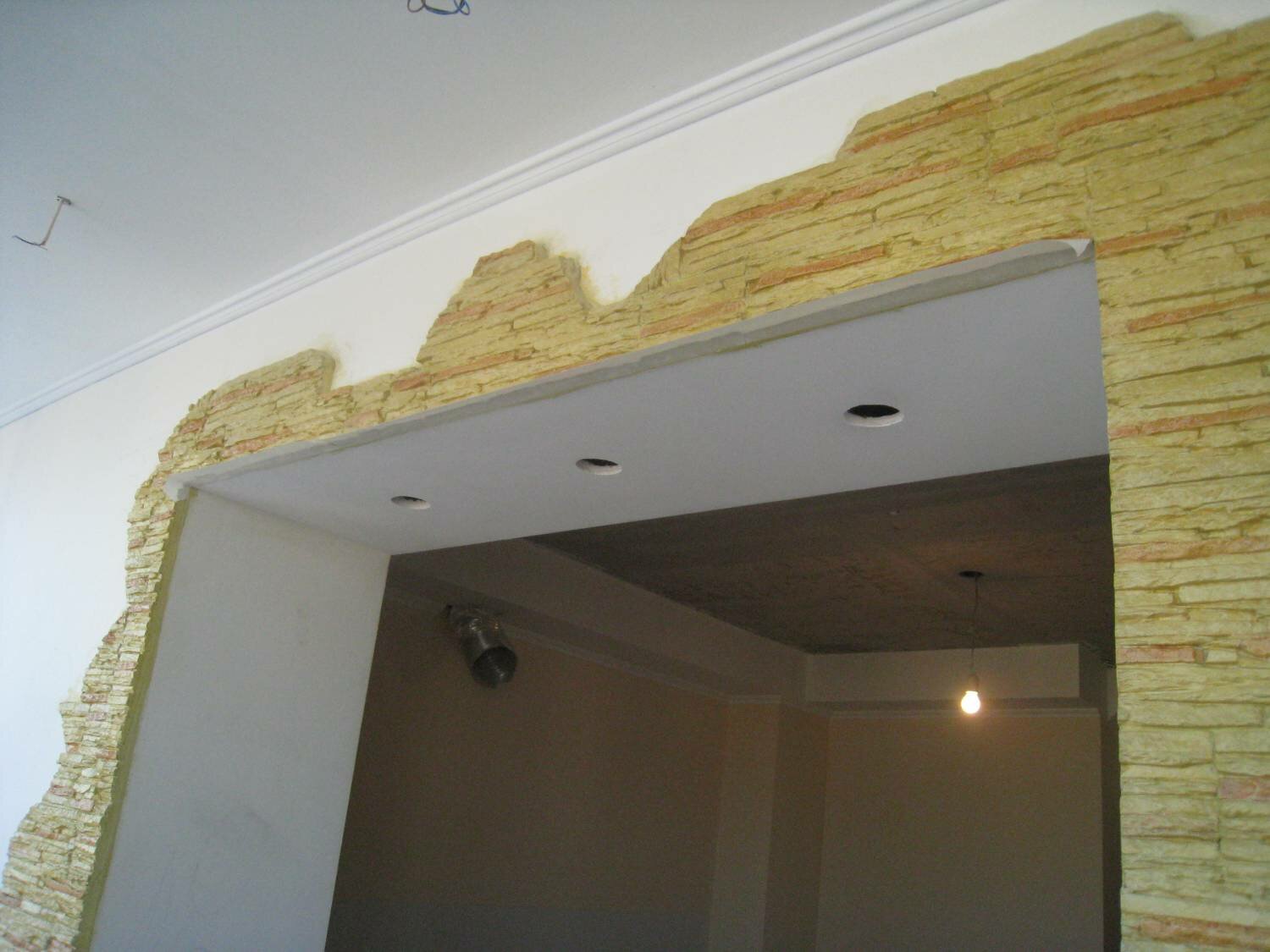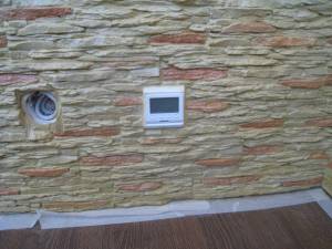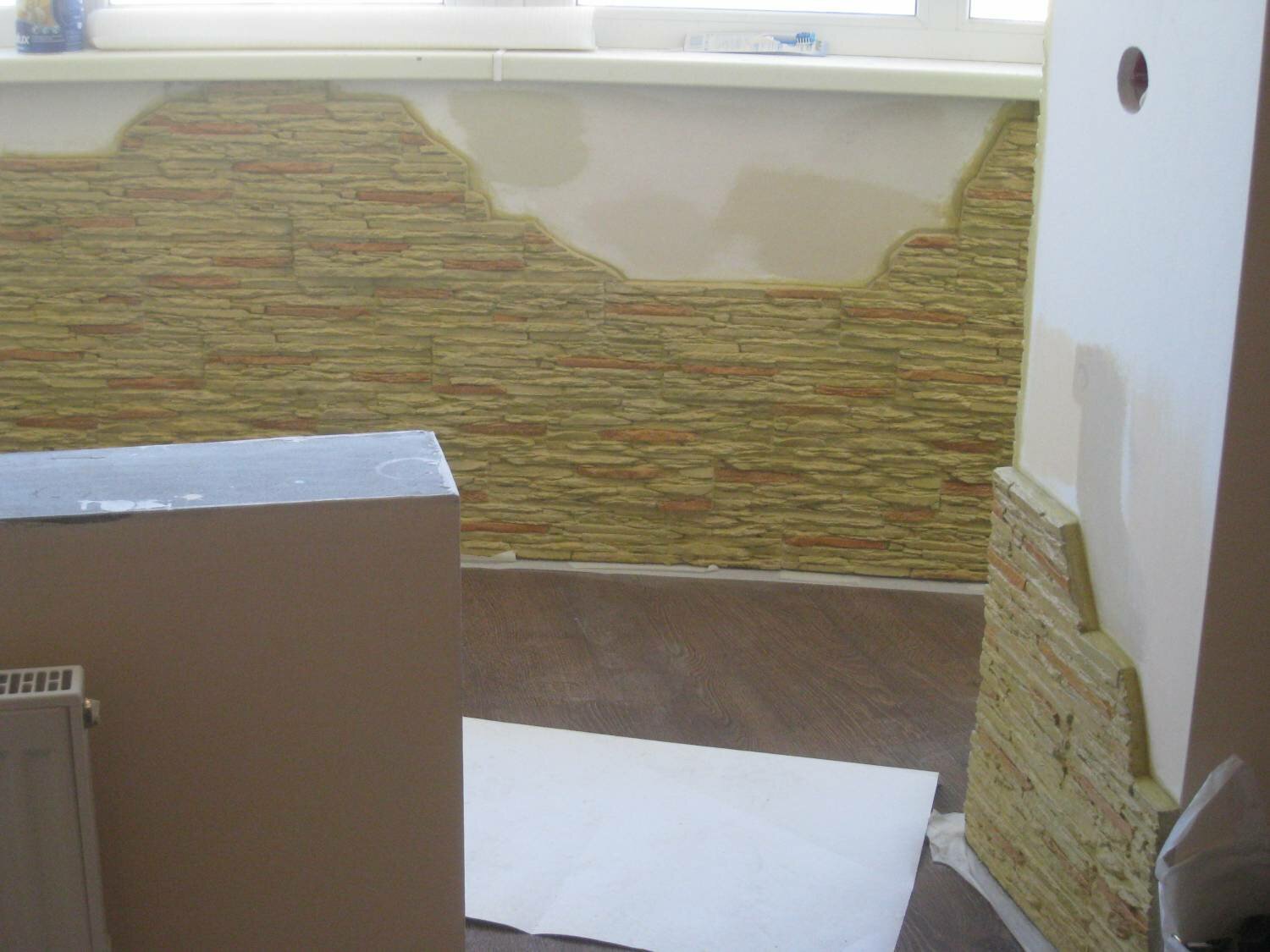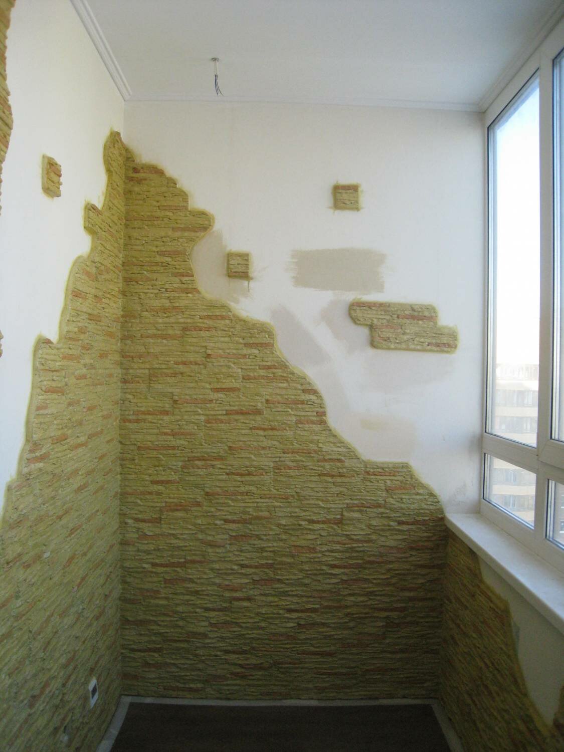 Что ж. Теперь настала очередь декоративного камня. Это плитки толщиной около сантиметра, имитирующие натуральный камень. Оклеенные обоями, но еще неокрашенные стены обложили декоративным камнем. Для укладки использовали плиточный клей.