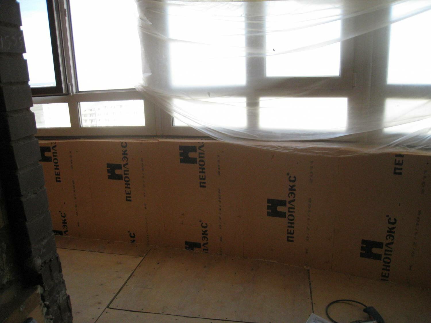 Затем приступили к отделке лоджии. На полу сделали обрешетку из бруска 50х50. Между брусками поместили утеплитель Пеноплэкс. Затем настелили фанеру толщиной 10мм, закрепленную на саморезы. На фанеру настилается специальный металлизированный экран (пленка толщиной 1мм). Затем укладывается электрический теплый пол. На него – пробковая подложка толщиной 2 мм. Поверх подложки настелили ламинат.