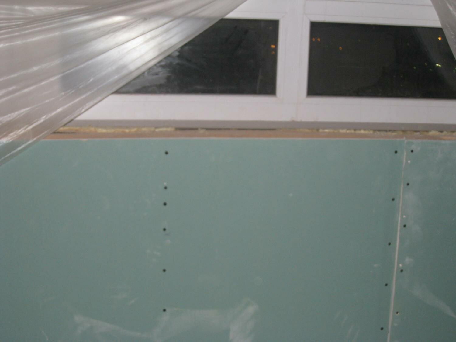 На потолке произведены аналогичные операции. Обрешетка из бруска, укладка Пеноплэкса, обшили влагостойким гипроком. Стены и потолок лоджии оклеили белыми флизелиновыми обоями под покраску. Надо заметить, что такие обои выдерживают покраску до 12 раз.