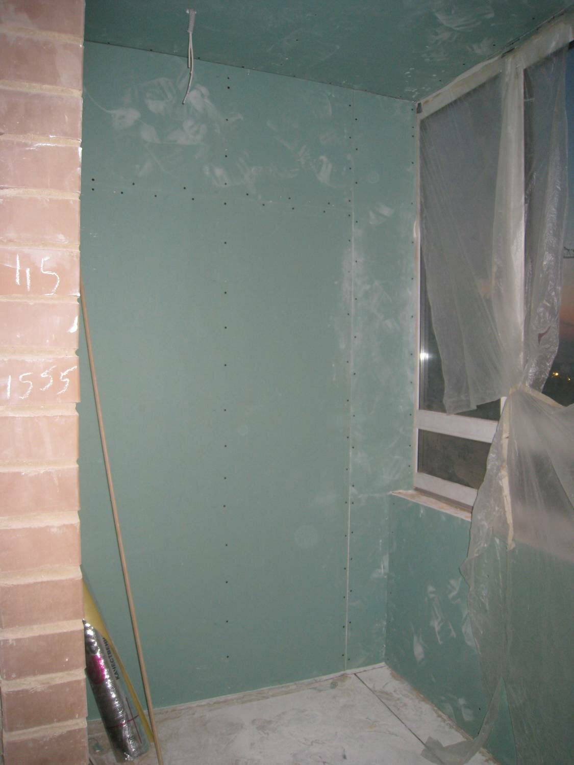 На стенах также сделана обрешетка из такого же бруска, проложен Пеноплэкс. Эта конструкция была обшита влагостойким гипсокартонном (гипроком), закрепленным на саморезы.