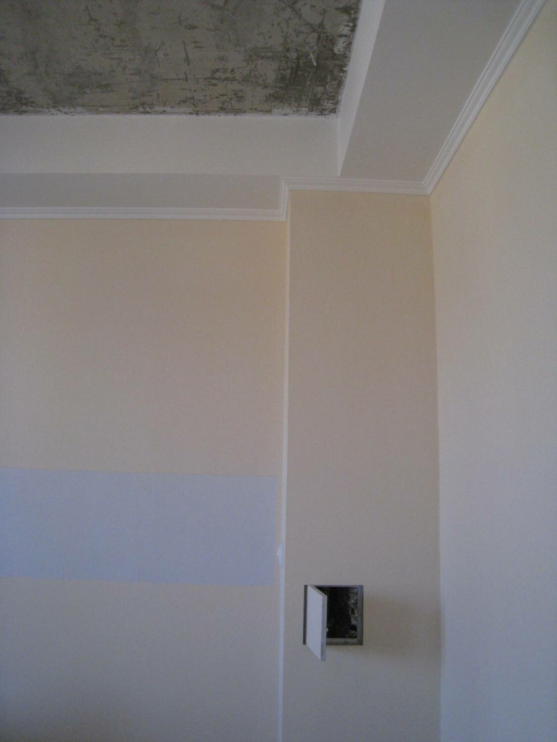 Обои на кухне были покрашены водоэмульсионной краской. Потолок установлен натяжной.