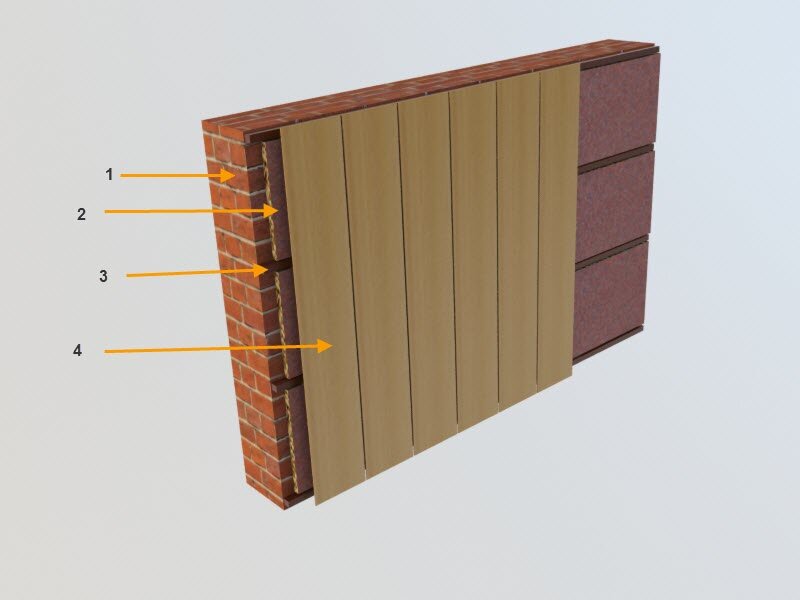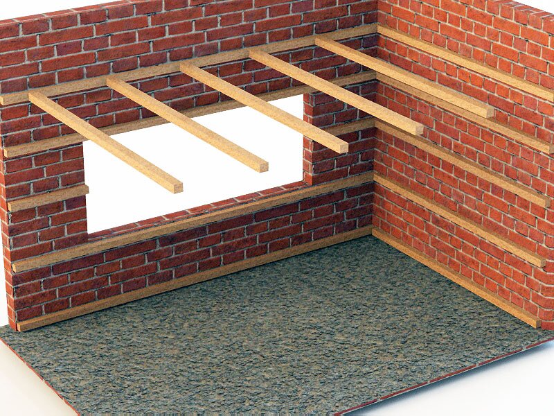 На стены в круговую я набил деревянные бруски 50х50мм в качестве обрешетки с шагом в 60 см (по ширине плит утеплителя), проверяя их вертикальность по уровню и отвесу. Такой же каркас соорудил на уровне будущего потолка. Схематично получилось это как-то так: