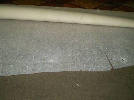 Следующим этапом стала укладка утеплителя под линолеум. Перед тем как положить утеплитель нужно хорошенько подмести пол, чтобы на нём не было никаких камешков, щепок и другого мусора который может в дальнейшем сотворить неровности и повредить покрытие. Убедившись, что все чисто я размотал утеплитель и положил его на пол таким образом, чтобы между полосами утеплителя не было щелей, и они нигде не завернулись.