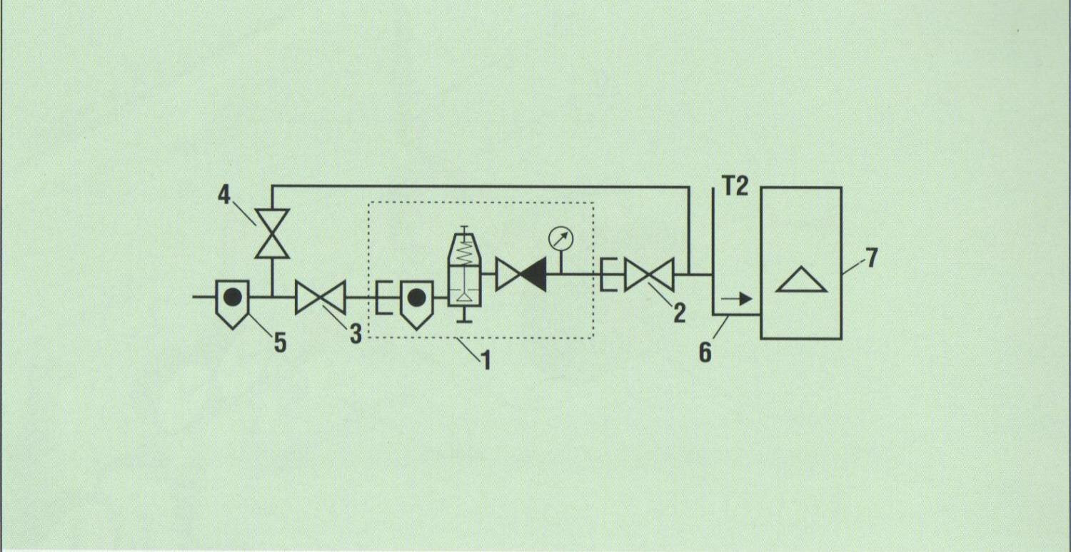 Монтаж устройства автоматической подпитки не представляет особой сложности и его можно производить на трубах из любого материала. На входе и выходе редуктора следует установить шаровые краны (2) и (3), диаметром 1/2". Для ускорения наполнения системы предусматривается байпасная линия с шаровым краном (4). Желательно установить дополнительный фильтр грубой очистки (5) на входе в узел. Подключать собранный узел следует к обратной магистрали (6) отопительного котла (7).