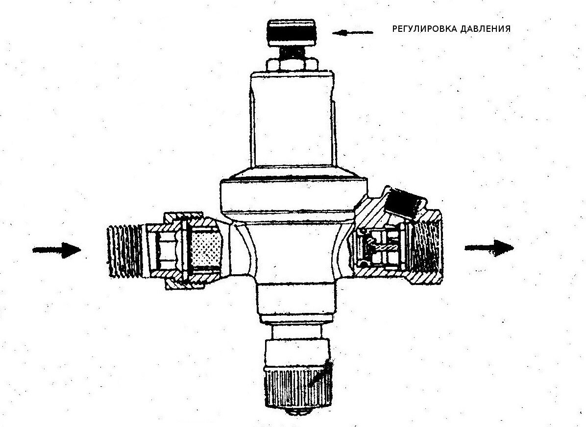 Это устройство состоит из регулируемого редуктора давления (1), который поддерживает постоянное давление в системе, в диапазоне 1-3 атм. Требуемое давление устанавливается редукционным клапаном, на который с одной стороны воздействует пружина, а с другой стороны мембрана, воспринимающая давление жидкости в системе отопления. Регулируя жёсткость пружины – устанавливают требуемое давление подпитки. В редукторе, также, содержится обратный клапан, который предназначен для устранения противотока жидкости, при повышении давления в системе отопления, например из-за перегрева теплоносителя. На входе в редуктор установлен фильтр грубой очистки воды, препятствующий попаданию механических примесей. Производить чистку этого фильтра очень легко – открутив накидные гайки быстроразъёмного соединения. На редукторе установлен манометр для визуальной калибровки редуктора. Регулировку давления производят винтом, расположенным сверху редуктора – для увеличения давления винт затягивают, а для уменьшения – отпускают. На нижней стороне редуктора находится регулятор стопорного устройства, которое позволяет полностью перекрыть подачу воды в редуктор. Для перекрытия подачи воды, следует затянуть винт, а для возобновления – ослабить.