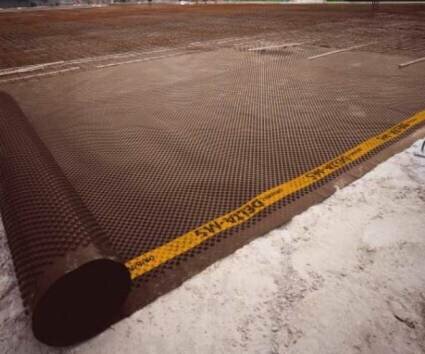 Чтобы обеспечить защиту гидроизоляции фундамента, геомембрану укладывают к изоляционному слою стороной, на которой присутствуют выступы, после чего натягивают поверх изоляции и крепят к стене с помощью самоклеящихся гвоздей. Профилированную мембрану можно также применять в качестве замены бетонной подготовки, используя арматуру, которая крепится на ней пластиковыми фиксаторами.