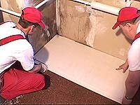 Все работы по ремонту пола нужно делать после того, как закончили работы с потолком и стенами. Обязательно соблюдайте технику безопасности. Вся электропроводка в ремонтируемом помещении (комнате) должна быть обесточена во избежание замыканий и несчастных случаев. Работайте в защитных очках. Выравнивание полов элементами сборного пола из гипсоволокна Современные технологии предлагают множество вариантов выравнивания чернового пола, рассмотрим один из них, предлагаемых фирмой «Кнауф». В качестве выравнивающего слоя используется сухая засыпка из песков минерального и искусственного происхождения. В качестве основания под покрытия пола предусмотрена сборная стяжка, изготовленная из влагостойких гипсоволокнистых листов, элементов сборного пола (далее ГВЛ).