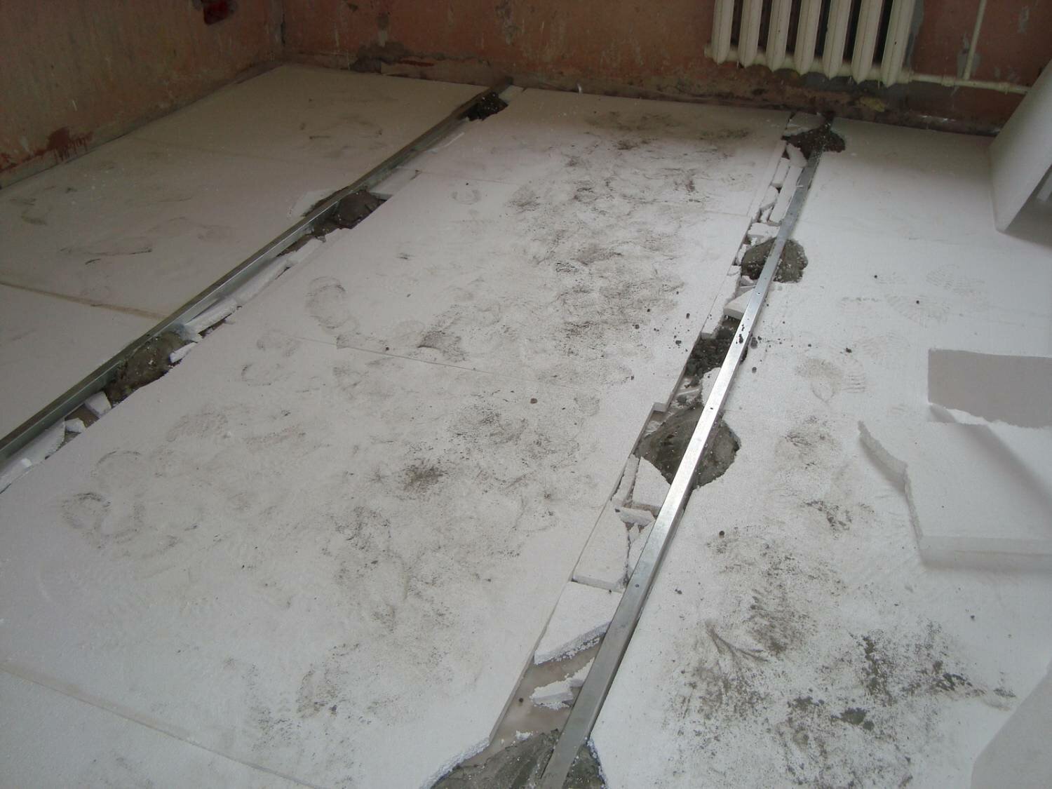 Далее происходит укладка полиэтиленовой пленки на пол и установка маячков, которые позволят достичь максимальной горизонтальности пола. Для маячков можно использовать обычные металлические направляющие, применяющиеся при изготовлении конструкций из гипсокартона. Маячки укладываются прямо на пол при помощи строительного уровня. Для фиксации их в требуемом положении разводится густой раствор цемента, и укладывается порционно по длине маячков. В это же время на пол между направляющими вставляются плиты из пенопласта. Основным их назначением является заполнение пространства пола для экономии раствора, а также тепло- и звукоизоляция.