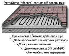 Устройство тёплого пола осуществляется при помощи специальных нагревательных электрокабелей. Как правило, напольное отопление устраивается под каменными или плиточными полами в ванных комнатах, туалетах и в жилых комнатах. При установке обогреваемого пола отпадает необходимость в других видах отопления помещения.