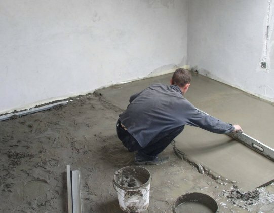 Если же пол дома бетонный, то здесь со шлифмашинкой делать нечего, используем стяжку. Удаляем с пола линолеум или любое другое покрытие, остается голая бетонная плита. Потом наносим на пол раствор из цемента либо смесь специальной самовыравнивающейся смеси. Горизонтальность также выставляется при помощи строительного уровня.