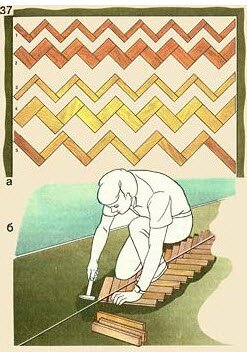 После того как поверхность пола выровнена, приступают непосредственно к укладке паркета. Предварительно на пол настилается фанера, благодаря чему обеспечивается более высокая надежность конструкции. Планки штучного паркета приклеиваются к фанерному основанию. Для большей прочности, в частности на время высыхания клея, с торцов планки прибиваются гвоздями к фанере.