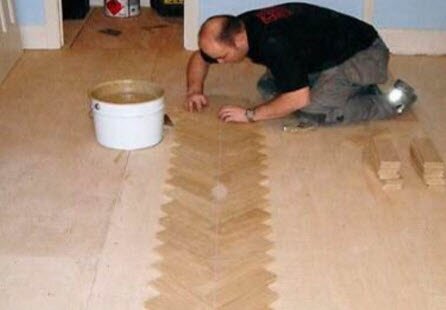 Сама фанера также приклеивается, а затем прибивается к поверхности пола с помощью дюбелей, для крепления на лаги больше подходят шурупы (важно, чтобы они не проходили насквозь). Для защиты паркета от влаги используют листы водостойкой фанеры толщиной от 1 до 2 см, чаще всего нарезанные на квадраты. В общем случае, желательно брать фанеру на 5 мм тоньше самого паркета. После настила фанеры её при необходимости шлифуют, и только тогда можно приступать к укладке паркета. Клей наносится на поверхность фанеры тонким слоем с помощью специальных шпателей, с помощью которых он распределяется равномерно и в необходимом количестве. Затем производится дополнительные крепеж с помощью гвоздей, их количество зависит от размера планки.