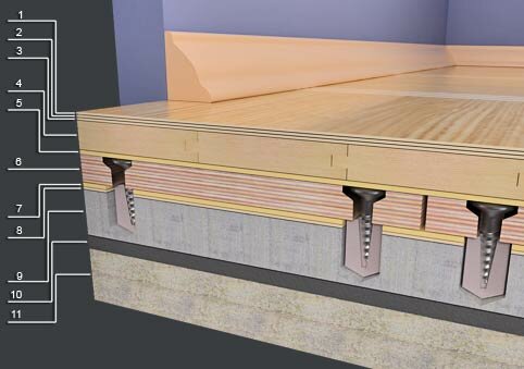 Если для Вас большие сроки укладки паркета неприемлемы, то можно пойти путем установки лаг. Как уже упоминалось, лаги представляют собой доски, не обязательно струганные. По размерам достаточно будет использовать доски шириной от 8 до 10 см, толщиной от 2,5 до 4 см, главное, просушенные до остаточной влажности мене 20%. В любом случае под лаги желательно подкладывать рубероид, чтобы избежать их загнивания. Крепеж досок к основанию пола осуществляется на болты-стойки. А затем с их помощью производится регулировка в вертикальном направлении (при необходимости их можно поднять или опустить). Одна из недопустимых ошибок при установке лаг – слишком большое расстояние между ними. Поэтому на досках экономить не стоит, иначе паркет будет неизбежно прогибаться. А ведь установка лаг занимает не так уж много времени. В стандартной трехкомнатной квартире на эти работы уйдет не больше суток. По завершении на лаги настилаются листы фанеры.