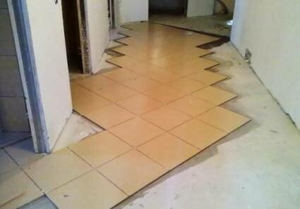 Прежде чем приступить к укладке плитки, надо тщательно выровнять поверхность. Если дом деревянный, то снизу нужно уложить фанерную плитку толщиной 12 миллиметров. Легче всего с бетонными полами, тем более, если есть гидроизоляционная прослойка.