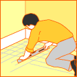 Начните с нанесения клея на один квадратный метр пола в любом из углов, образованный меленым шнуром в центре комнаты