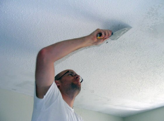 6. Пока вы соскребаете шпателем побелку в одной части потолка, другая часть должна пропитываться водой. Так вы быстрее справитесь с меловой поверхностью. При удалении покрытия шпателем сразу расширяйте трещины. Это удобно при влажной штукатурке.