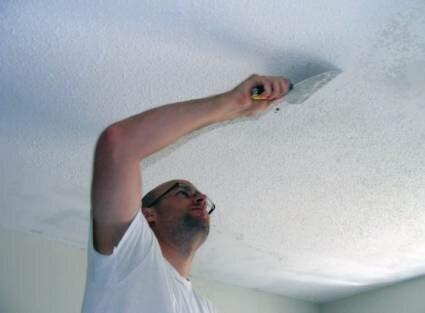 5. Шпателем попробуйте снять побелку. Пропитанный водой мел будет сниматься небольшими пластами. Если вы использовали недостаточное количество воды, то появится пыли, значит, еще раз распылите воду. Если побелка начинает течь по шпателю, то дайте влаге получше впитаться в меловую поверхность.