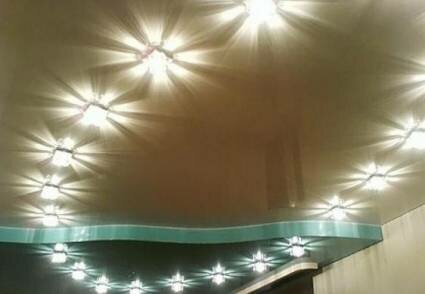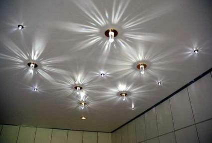 Установив светильники на натяжных потолках вы сможете в значительной степени украсить комнату, преобразить ее вид, при этом нужно придерживаться определенной мощности осветительных приборов. От чрезмерно мощных галогенных лампочек лучше сразу отказаться, потому что они слишком сильно нагреваются и это может стать причиной плавления материала, из которого изготовлен натяжной потолок. Даже применяя не очень мощные лампочки можно сделать освещение ярким, все зависит от количества светильников. Как мы уже отмечали выше, если речь идет не о лампочках накаливания, для каждого светильника пригодится особая термоизоляция. Если этого не сделать, то со временем натяжной потолок может провиснуть.