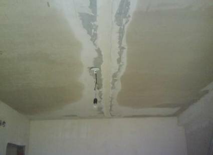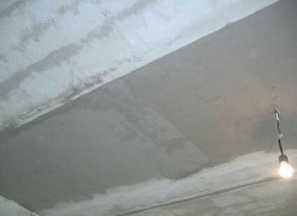 В случае со шпатлевкой мы чистим потолок от пыли, грязи, пятен и т.п.. Потом обрабатываем плоскость грунтовкой, швы закрываем армирующей сеткой. Берем стартовую шпатлевку, разводим ее в воде и мажем на потолок. Толщина - полтора миллиметра. после нанесения разглаживаем и сверху мажем финишную шпатлевку, после чего шлифуем и можно будет окрашивать водоэмульсионкой. В чем преимущество выравнивания шпатлевкой? Вы никак не влияете на высоту комнаты, не тратите много денег и это экологично. Среди недостатков можно выделить сложность нанесения, вы не сможете убрать таким образом явные перепады, в процессе эксплуатации могут появиться трещины.