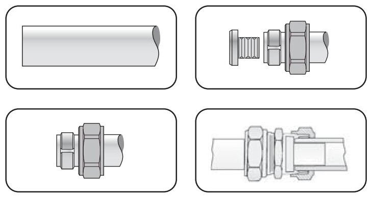 получить с помощью pазнообpазных металлических фитингов. Стыки геpметизиpуются уплотнительными кольцами, поставляемыми в комплекте с фитингами, имеющими внутреннюю резьбу.