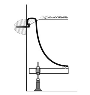 Устанавливаем шуруп–костыль, делаем 4 разметки на примерно одинаковом расстоянии друг от друга в верхнем крае ванны, убираем ванну. Измерив ширину бортика ванны, отмеряем от разметки это расстояние и сверлим. Вкручиваем шуруп-костыль и ставим ванну на место.