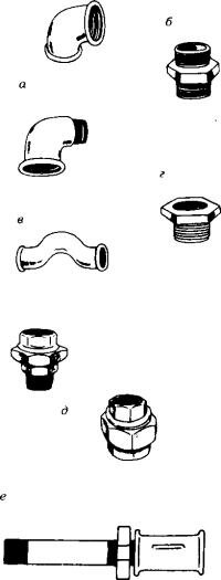 Рис. 1. Резьбовые фитинги: а - угольник, б - ниппель, в - обвод, г - футорка, д - разъем "американка", е - сгон с контргайкой и муфтой.